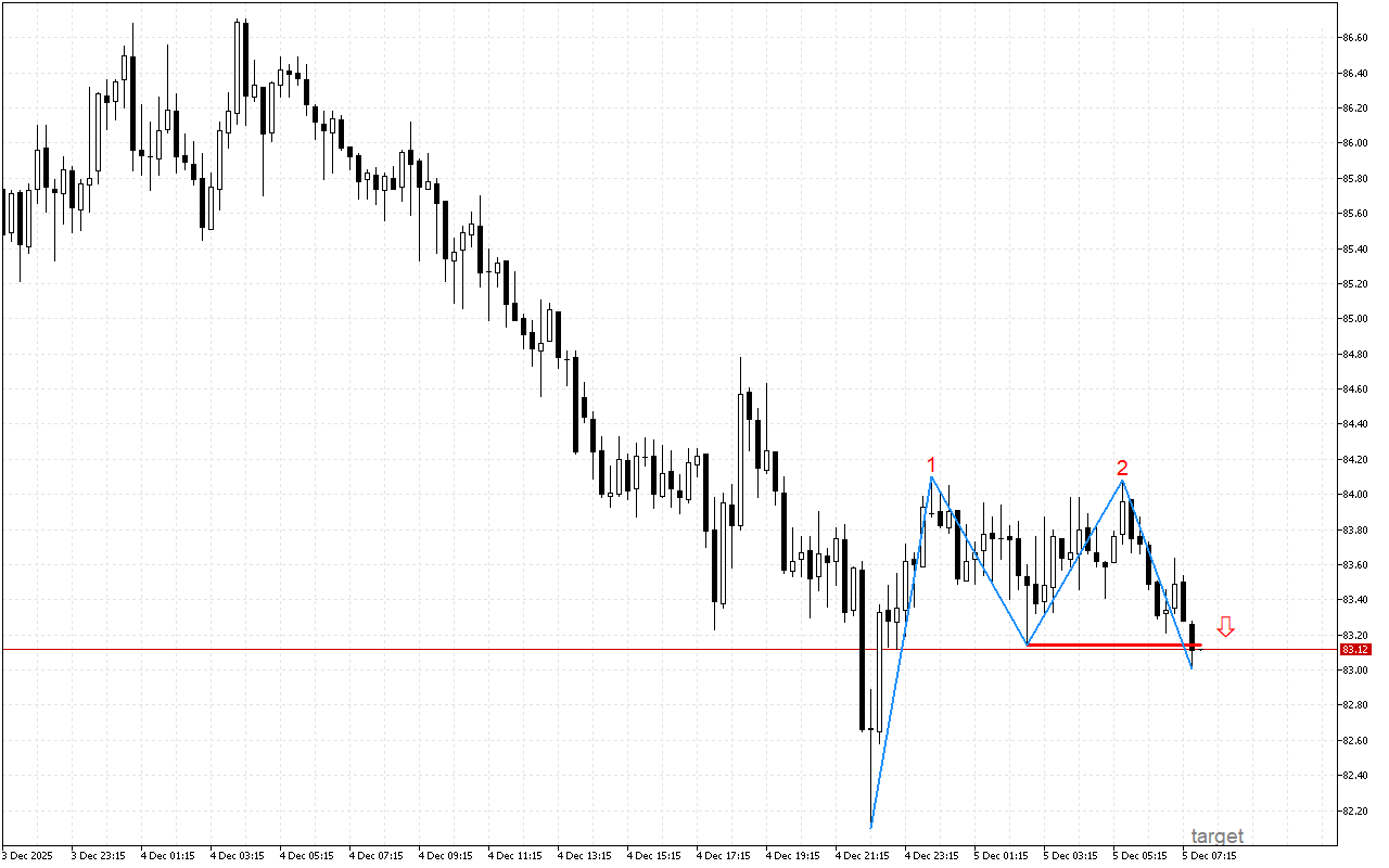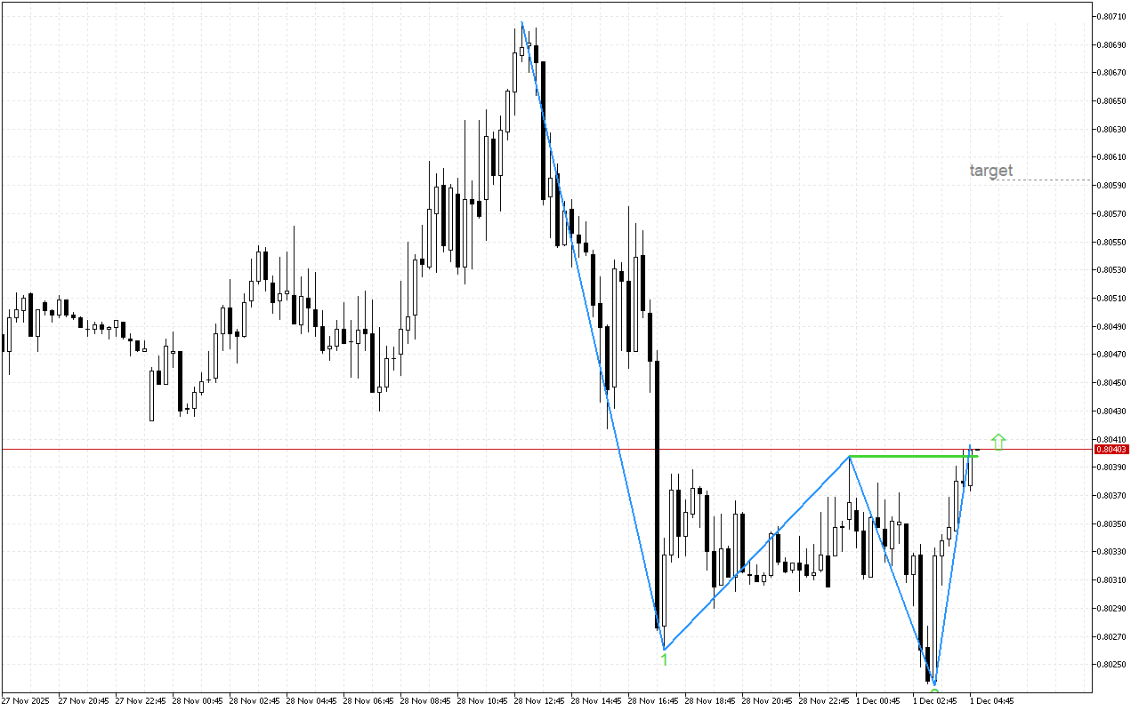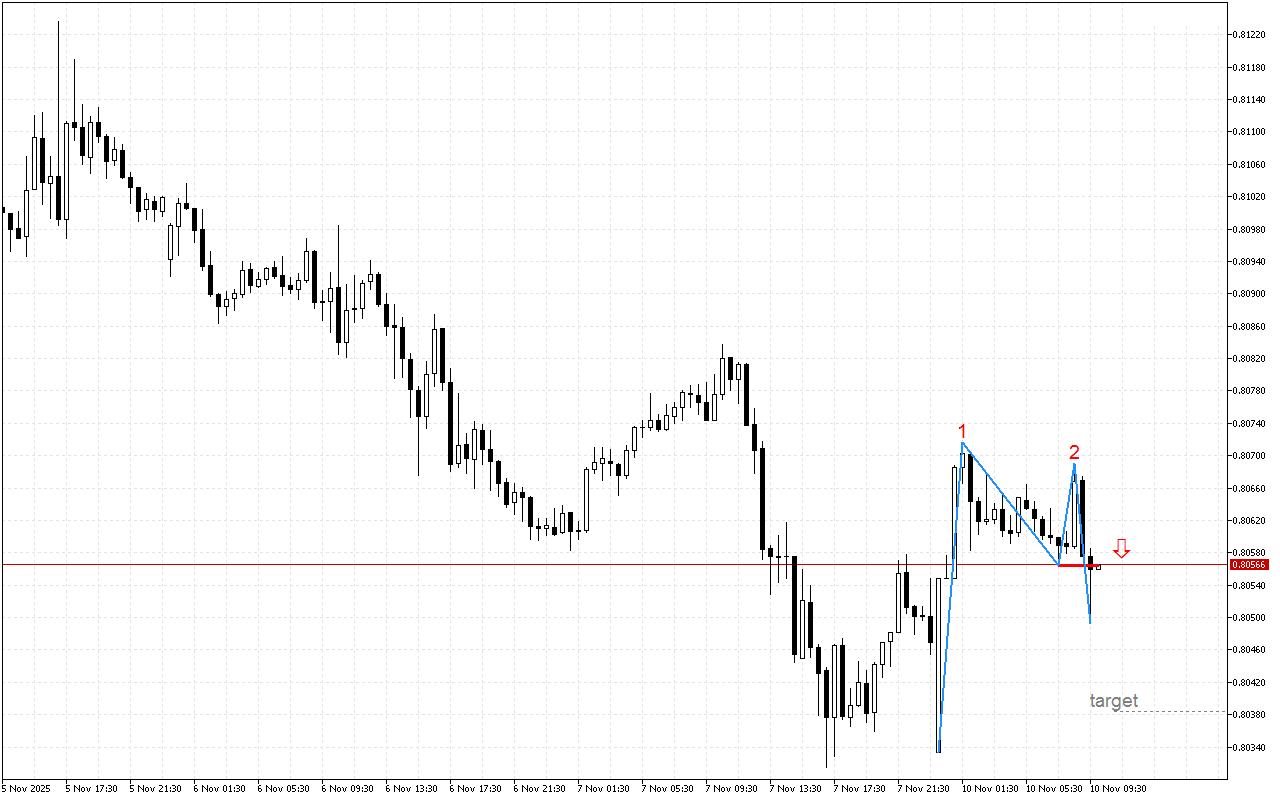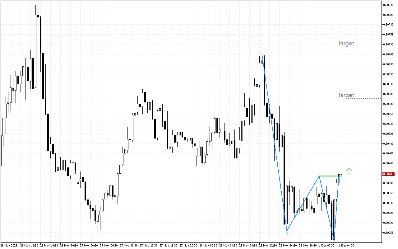 Ағымдағы уақытша интервалда саудаға қызығушылық төмендеуі байқалады. Бұл USDCHF бағасының кері кетуіне әкелуі мүмкін.Графикада ықтимал жоғары қарай айналма көрсететін қос төменгі паттерн пайда болды. Бұл паттерн растайтын маңызды сигнал 0.80398…