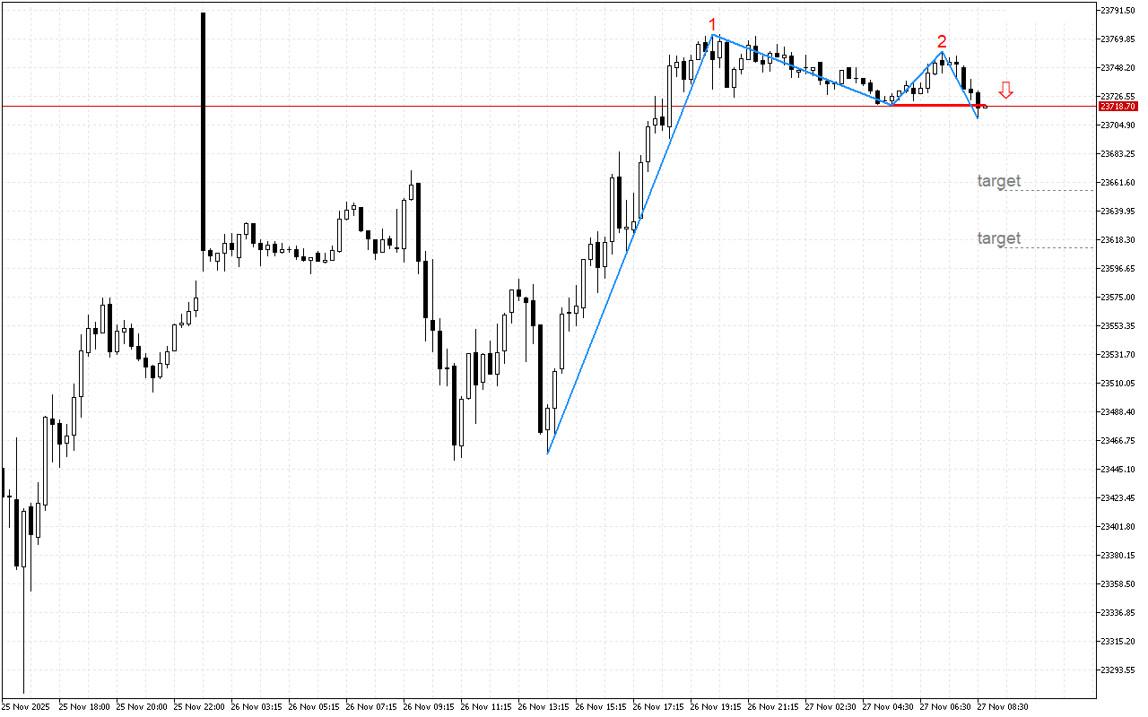 DAX 40 графикасында жоғары қозғалыста әлсіздік белгілерін көрсетеді, себебі баға қарсылық деңгейін жеңе алмайды.Графикада екі қайтара жоғарғы шек классикалық айналма паттерн қалыптасуы байқалады. Паттернді растаудың негізгі сигналы 23719.70 деңгейіндегі екі…