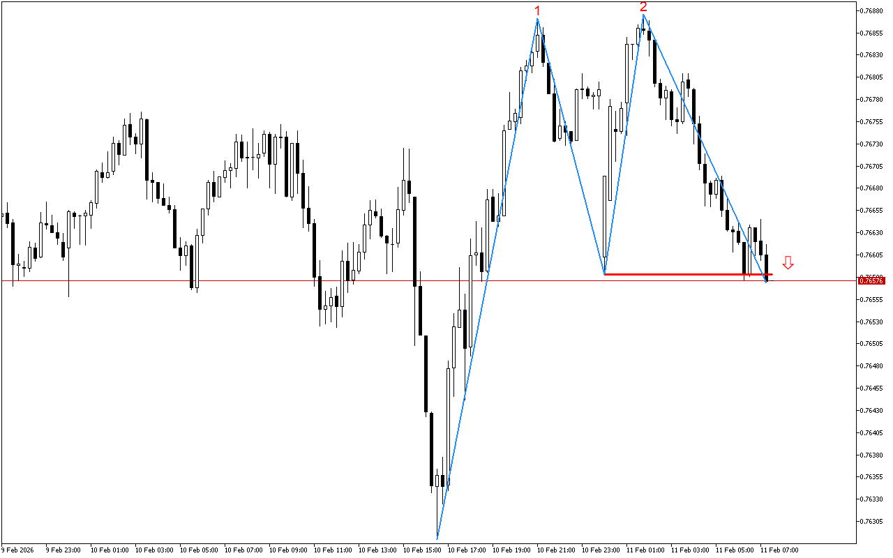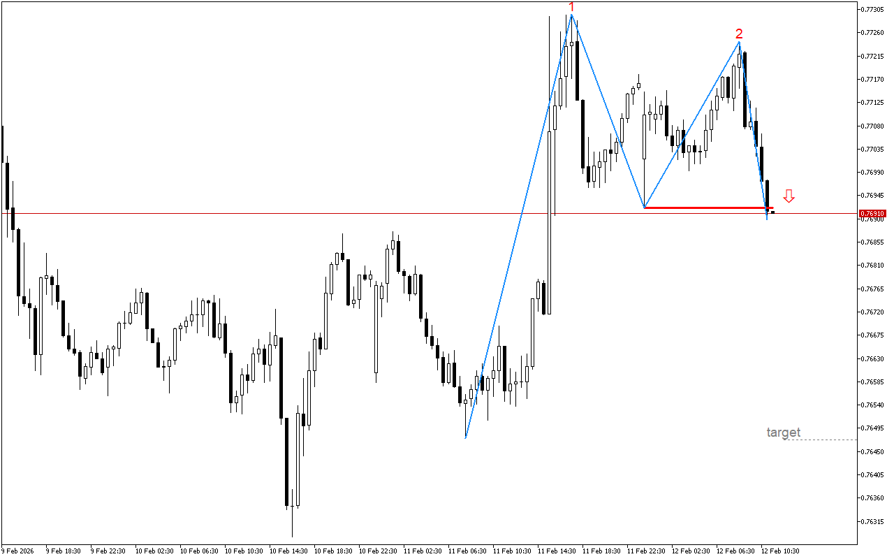 Ағымдағы уақытша интервалда саудаға қызығушылық төмендеуі байқалады. Бұл USDCHF бағасының кері кетуіне әкелуі мүмкін.Графикада ықтимал жоғары қарай айналма көрсететін қос төменгі паттерн пайда болды. Бұл паттерн растайтын маңызды сигнал 0.77588…